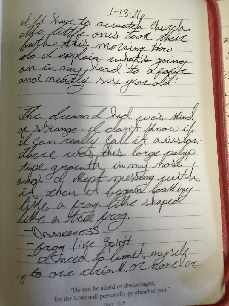 Looking back through my journal, I read an old dream I had this year about a ‘Frog In My Nose.” (January 18th, 2026)